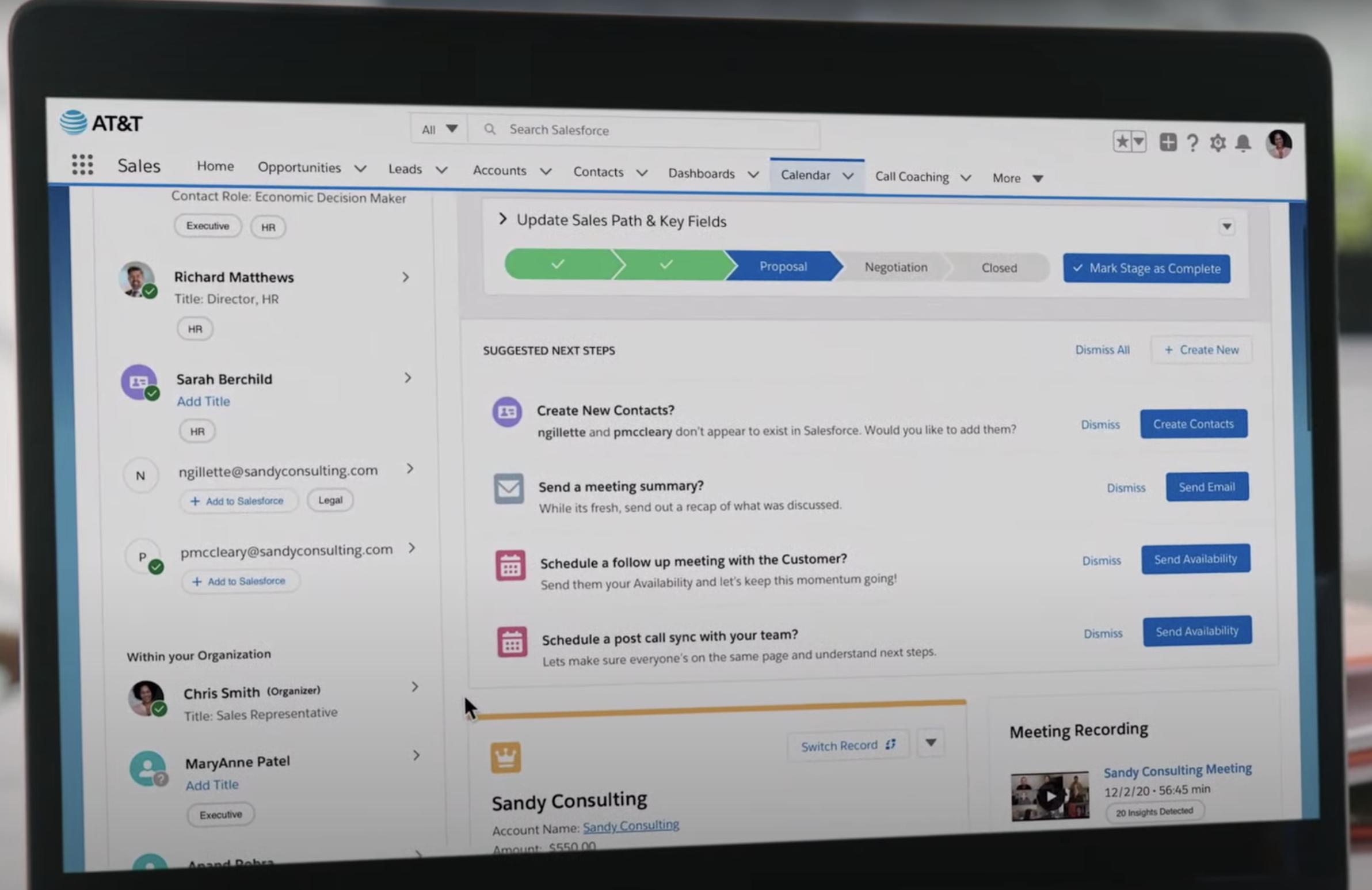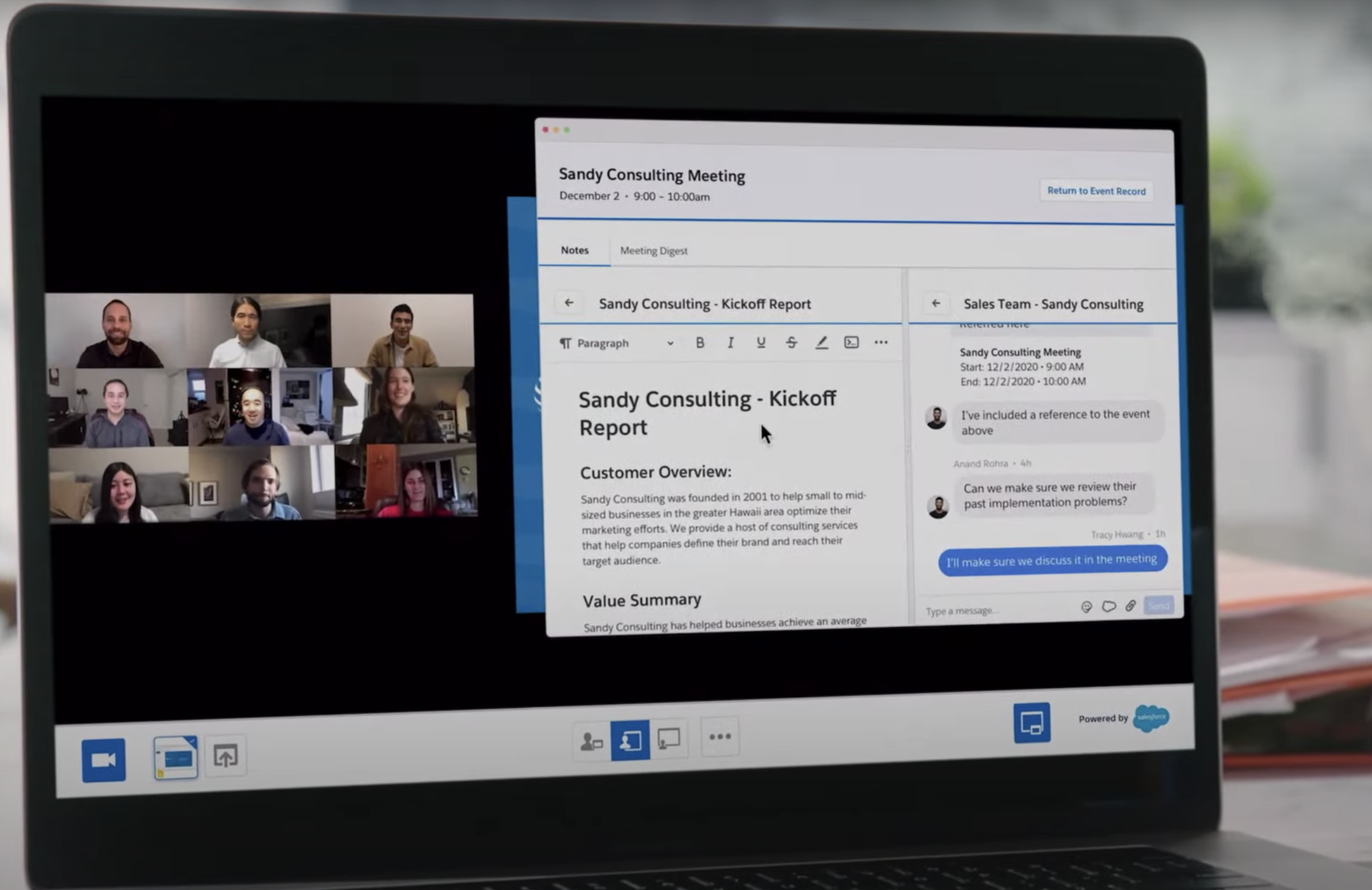 세일즈포스 내에서 비디오 콜을 진행할 수 있습니다. 미팅을 진행하면서 세일즈포스 시스템 내에 있는 정보를 모두 공유하면서 볼 수 있고, 미팅 노트를 작성하는 것도 가능합니다. 모두가 공유하는 미팅 노트를 작성할 수도 있습니다.
