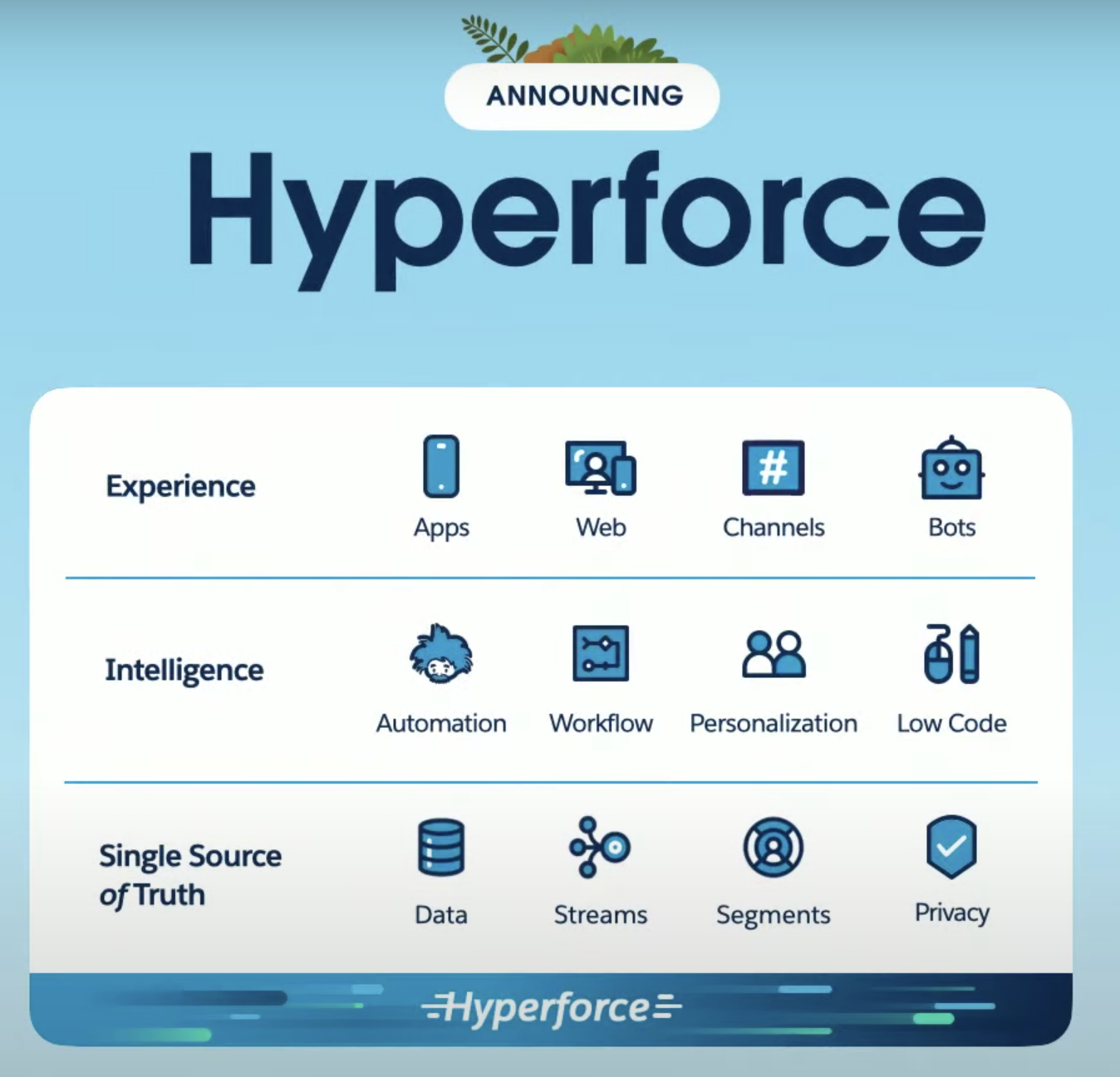 세일즈포스 전략의 핵심은 단일 고객 정보 - Customer 360 - 이기에 이를 더 강화 시킬 수 있는 플랫폼 기술들을 한데 모아 '하이퍼포스'라는 이름으로 재정의 하였습니다. Experience, Intelligence, Single Source of Truth 세 가지 영역으로 구분된 플랫폼에서 다양한 서비스를 제공할 예정입니다. 세일즈포스 플랫폼에서 제공하는 기술들을 CRM 을 중심으로 다시 정의하고 아키텍쳐를 최적화 하였다는 것이 주요 내용입니다.