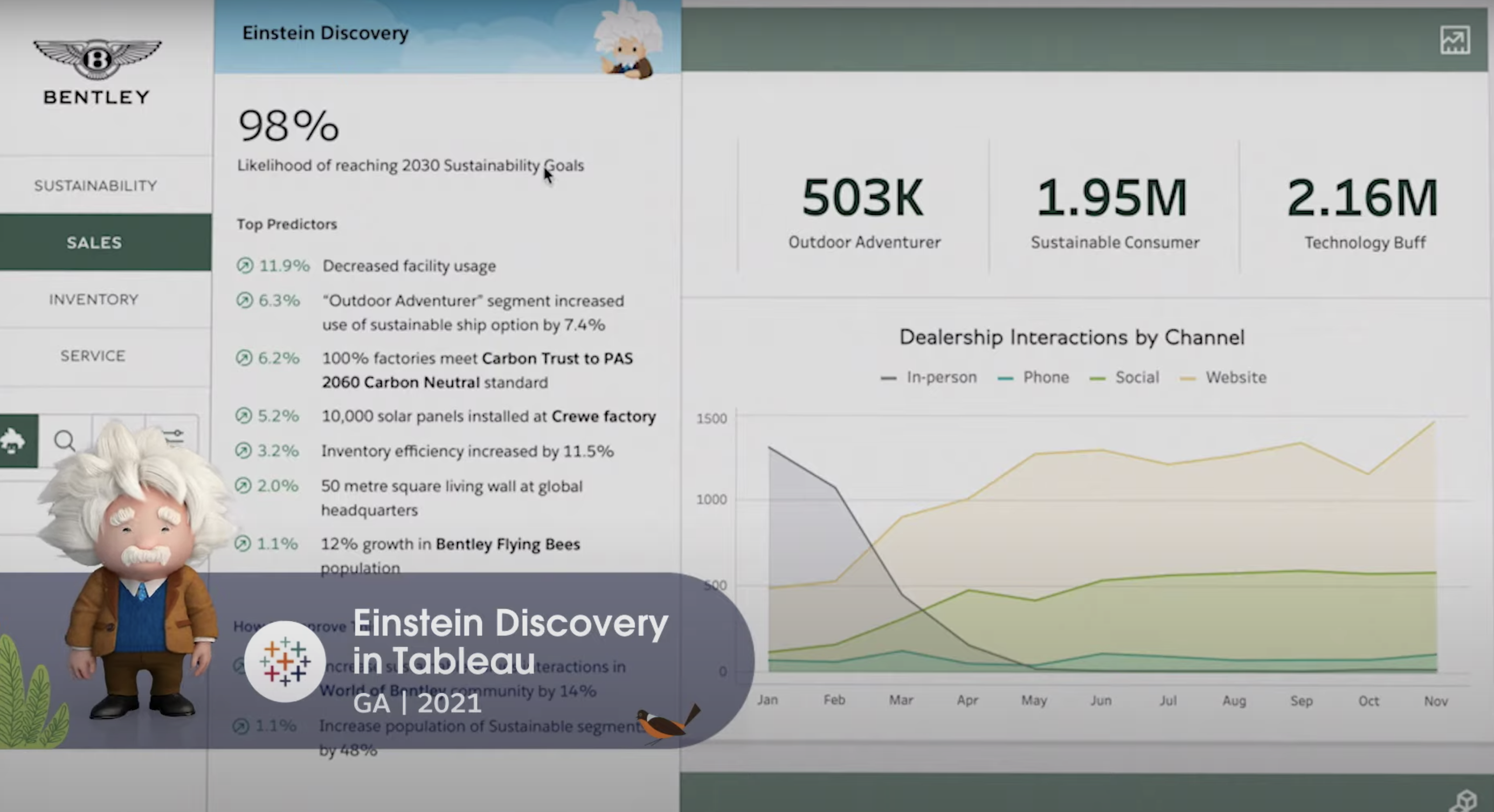 또한, 벤틀리는 태블로를 활용해 고객과의 모든 Engagement 및 영역(영업, 서비스, 마케팅, 지속가능성) 별 데이터의 대시보드를 만들고 Einstein Discovery in Tableau 를 활용하여 의사결정을 위한 예측 정보를 제공 받습니다.