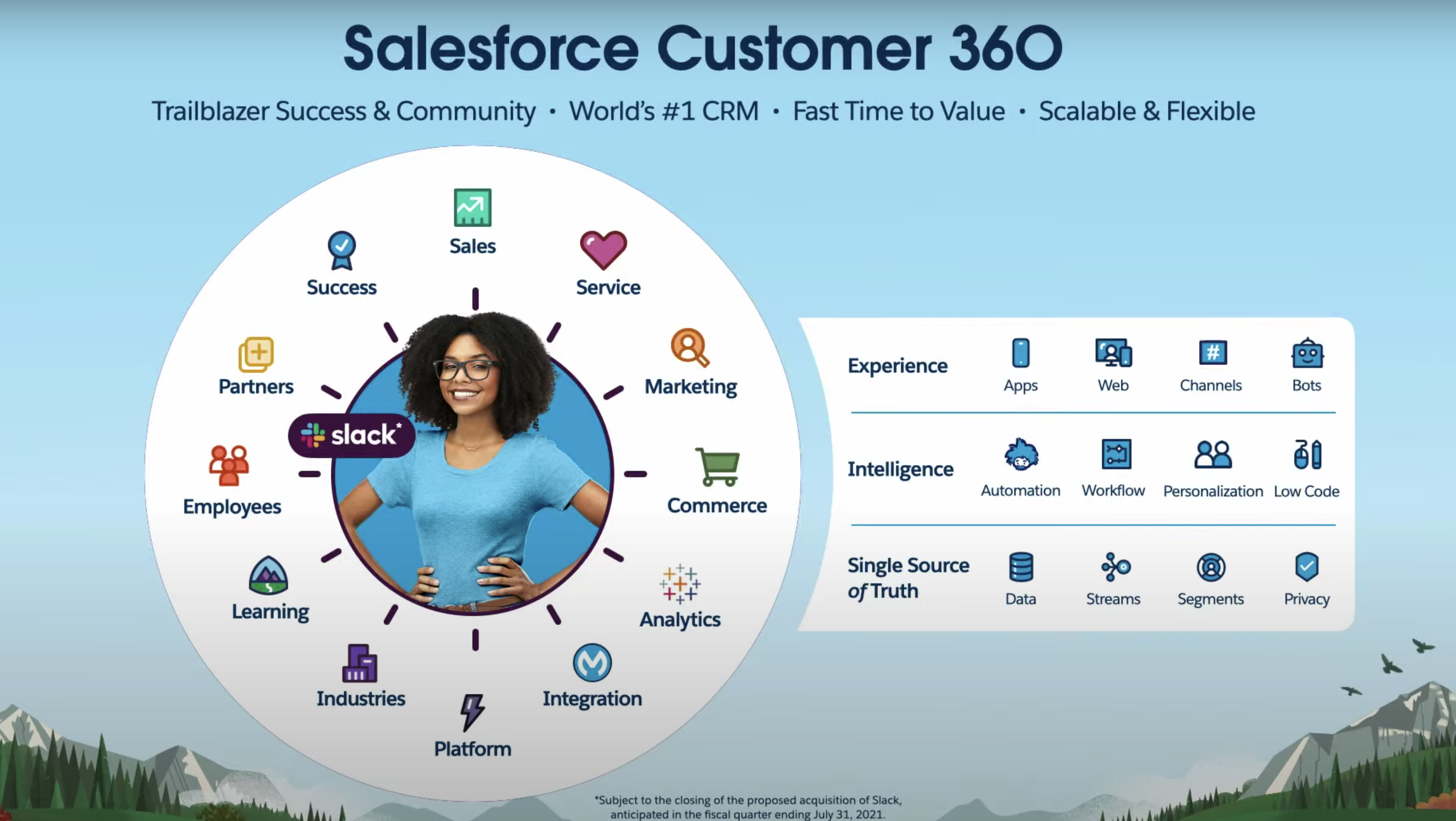 세일즈포스는 2019년 부터 Salesforce Customer 360 를 강조하고 있습니다. 고객의 데이터를 중심으로 세일즈포스의 모든 어플리케이션을 통합하겠다는 전략입니다. 올해 더 강조된 것은 슬랙을 Customer 360 포트폴리오에 포함시킴으로써, 온라인 공간에서 활동하는 고객과 직원들의 모든 데이터를 Customer 360 에 통합시키겠다는 포부를 밝혔습니다.