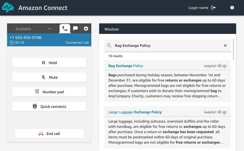 - Amazon Connect Wisdom (NEW) : 고객의 제품과 서비스 (Product and Service) 정보를 한 번에 모아 볼 수 있는 기능 / 세일즈포스 및 서비스나우와 연동 되어 머신러닝 기술을 활용해 Call transcription 을 듣고 정해진 Data Repository 에서 관련된 정보를 모아 에이전트에게 보여 줌. 혹은 에이전트가 직접 자연어로 된 질문을 던지면 그에 맞는 정보를 찾아 전달해 줌.