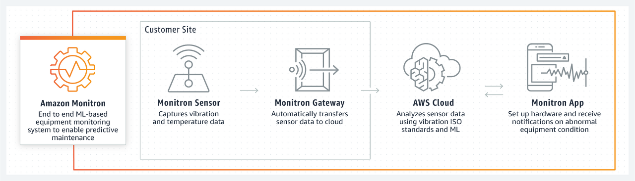 Amazon Monitron(NEW): 센서, 게이트웨이 디바이스 부터 클라우드, 모바일 앱 까지 End-to-End 로 설비 데이터를 수집할 수 있는 기능을 제공. 센서에서는 온도, 진동 등 단순한 센서 데이터 수집이 가능