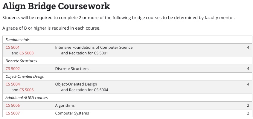 일단, 학교에서 제시하는 Academic bridge course 의 상세 내용은 이렇다. (http://catalog.northeastern.edu/graduate/computer-information-science/computer-science/computer-science-align-program-mscs/#programrequirementstext)
